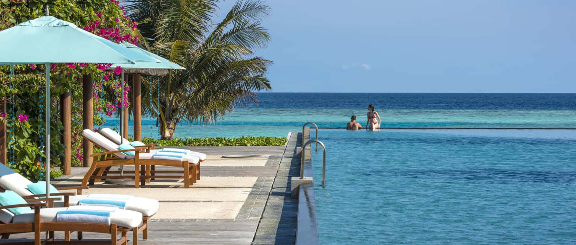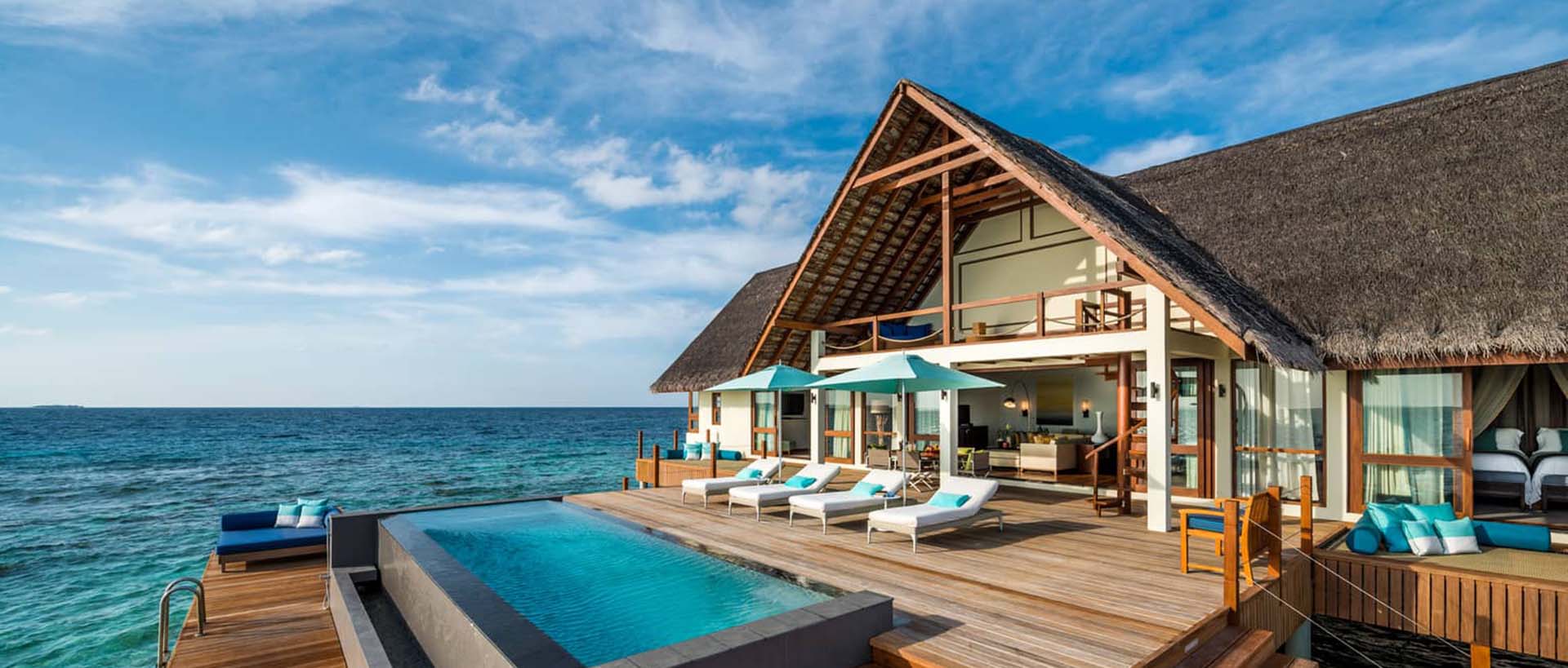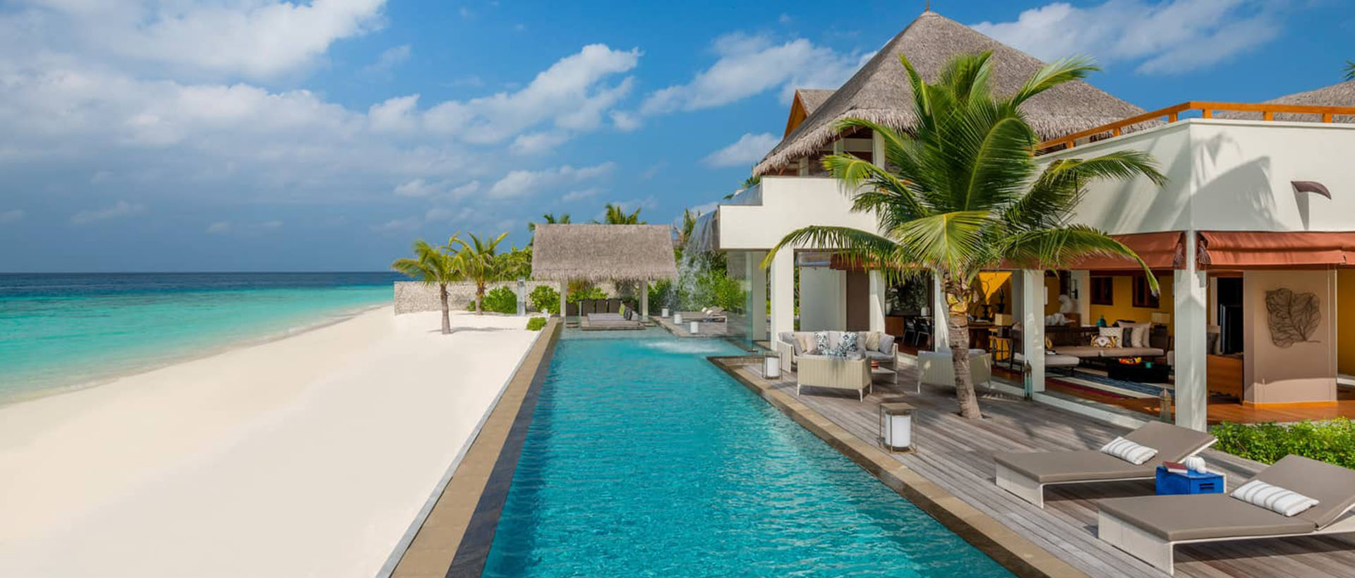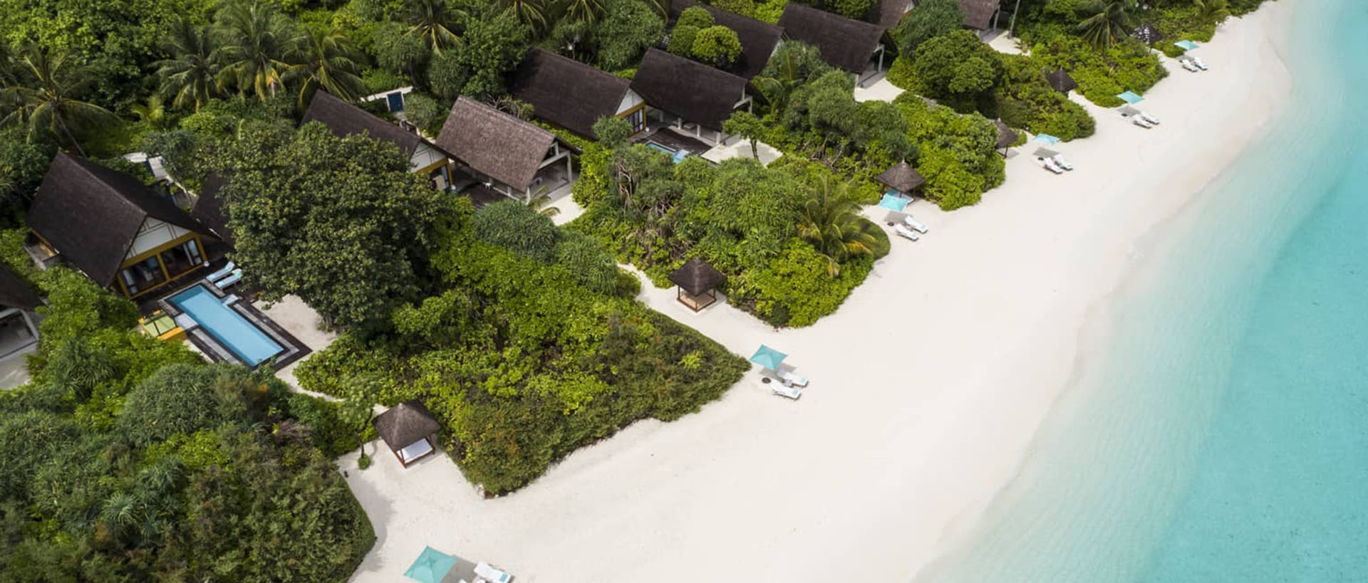 Береговые виллы с душем на открытом воздухе и частным бассейном находятся в южной части острова, на открытой прилегающей территории (260 м²) – бассейн (12 м2), терраса с шезлонгами, мягкая кушетка, открытый павильон; спальня с кроватью king-size или двумя отдельными кроватями twin, отдельная гардеробная; большая ванная комната с двумя раковинами, ванной и душевой кабинкой, ливневый душ под открытым небом.